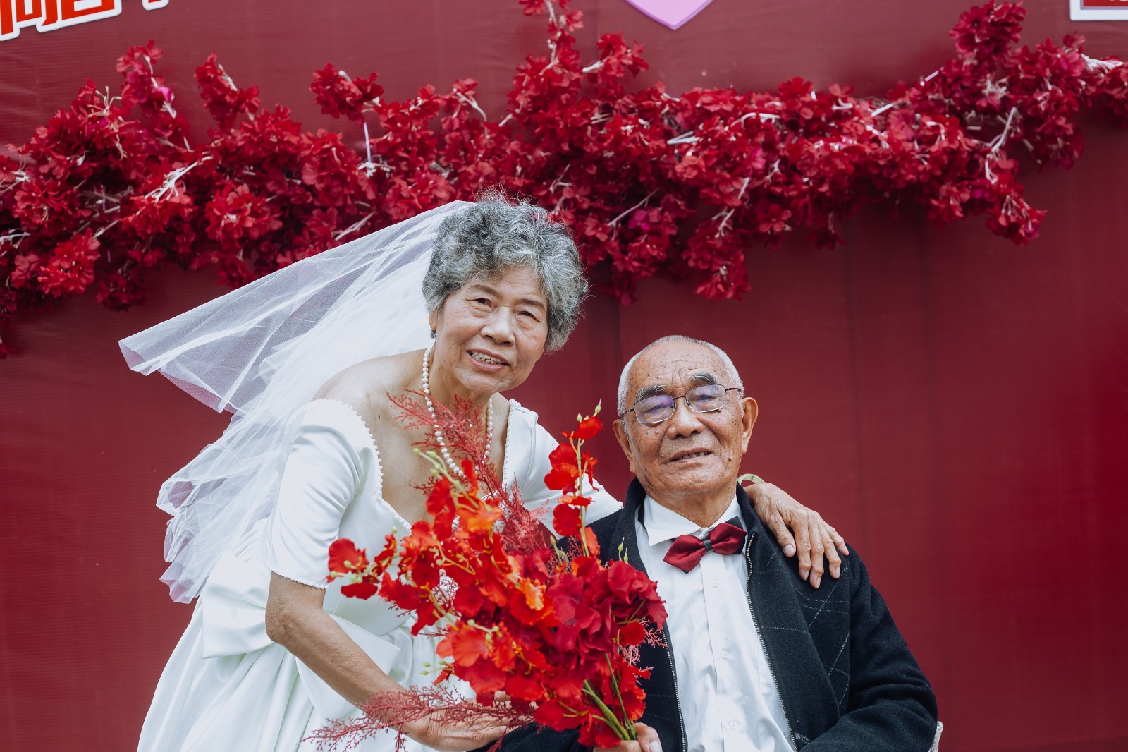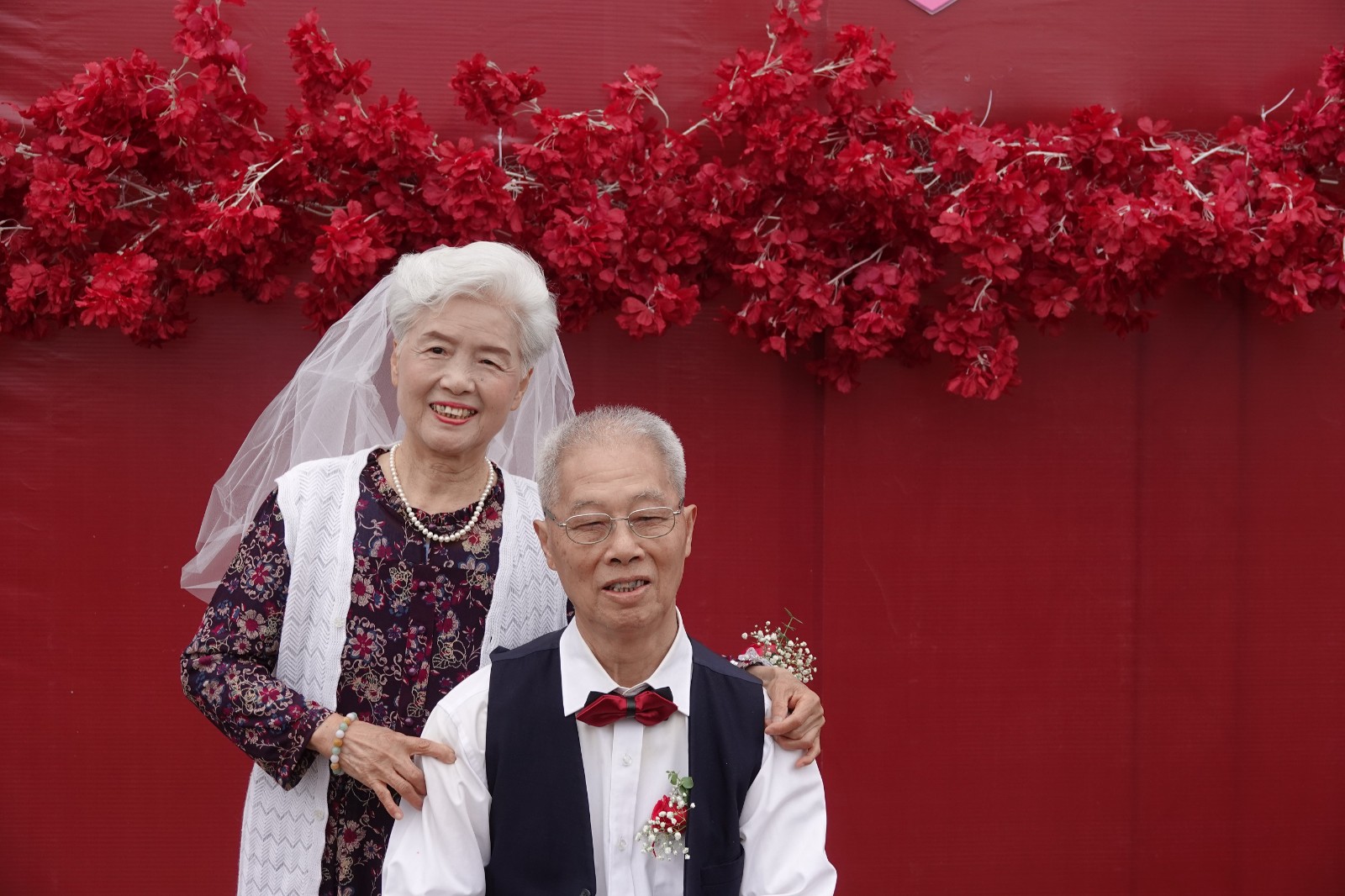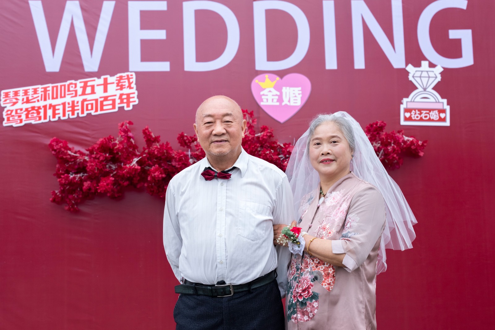 在金婚活動(dòng)現(xiàn)場(chǎng),共有40對(duì)金婚“新人”出席,他們臉上都洋溢著幸福的笑容。伴著柔和優(yōu)美的音樂,一對(duì)對(duì)“新人”手挽手,在親朋好友和現(xiàn)場(chǎng)嘉賓的見證下,獻(xiàn)花、擁抱、表白。時(shí)間仿若穿梭到50年前,那時(shí)的他們,有著青春的臉龐、挺拔勻稱的身形、羞澀淳樸的性格,在家中長輩的撮合下喜結(jié)連理。在那個(gè)物質(zhì)貧乏的年代,一紙婚約定終身,從此兩人相濡以沫、白頭到老。