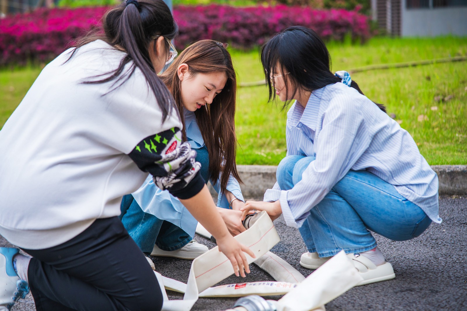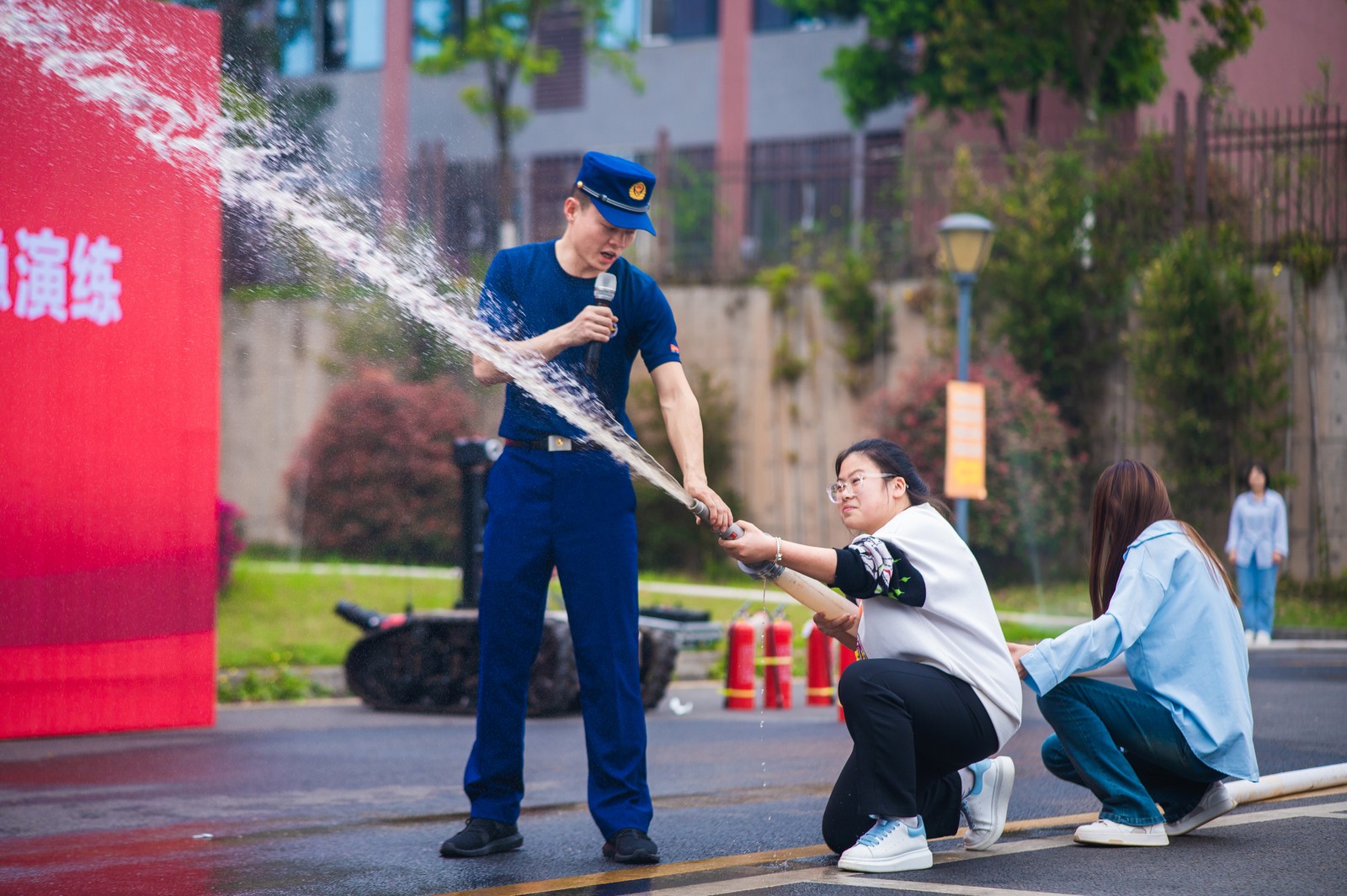演練結(jié)束后,納溪消防大隊教官就使用滅火器撲滅初期火災(zāi)和火勢擴(kuò)大后如何連接消防水帶進(jìn)行滅火進(jìn)行了培訓(xùn)講解,并指導(dǎo)教職工和學(xué)生進(jìn)行實操練習(xí)。通過“零距離”教學(xué),提升了參演人員應(yīng)急處置能力和自防自救能力。此外,消防隊還向大家展示了“飛龍”智能機(jī)器人的強大滅火功能,為大家?guī)砹艘粓鲆曈X盛宴。