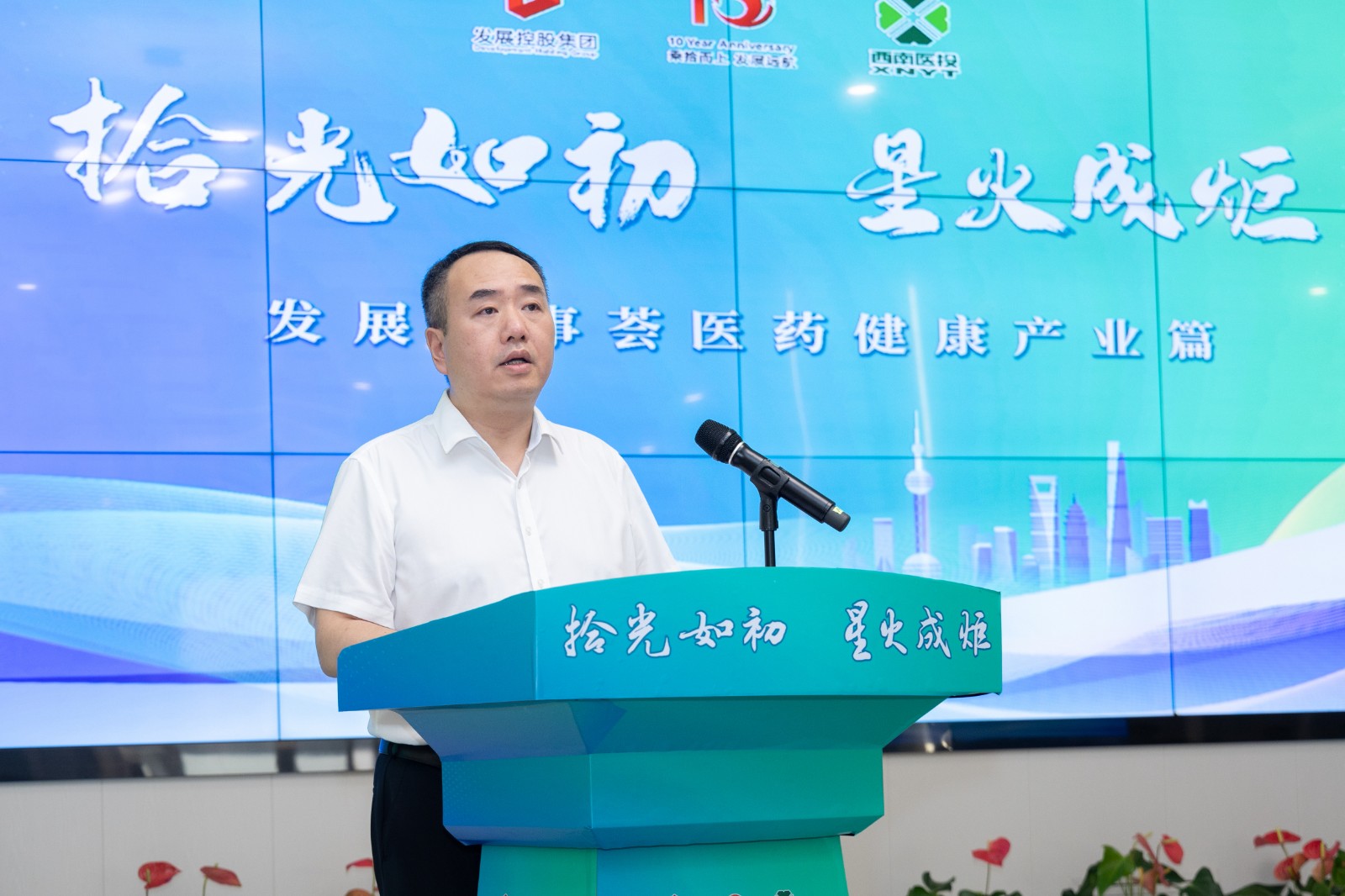 7月31日下午,由發(fā)展控股集團(tuán)主辦、西南醫(yī)投集團(tuán)承辦的“拾光如初,星火成炬”——發(fā)展故事薈之醫(yī)藥健康產(chǎn)業(yè)篇活動(dòng),在春江酒城嘉苑營(yíng)銷中心成功舉行。發(fā)展控股集團(tuán)黨委副書記、副董事長(zhǎng)、總經(jīng)理羅火明,發(fā)展控股集團(tuán)副總經(jīng)理、西南醫(yī)投集團(tuán)黨委書記、董事長(zhǎng)林健出席活動(dòng);發(fā)展控股集團(tuán)各部室及旗下一級(jí)企業(yè)相關(guān)負(fù)責(zé)人,西南醫(yī)投集團(tuán)本部全體員工,旗下各級(jí)企業(yè)領(lǐng)導(dǎo)班子和員工代表,共計(jì)100余人參加。