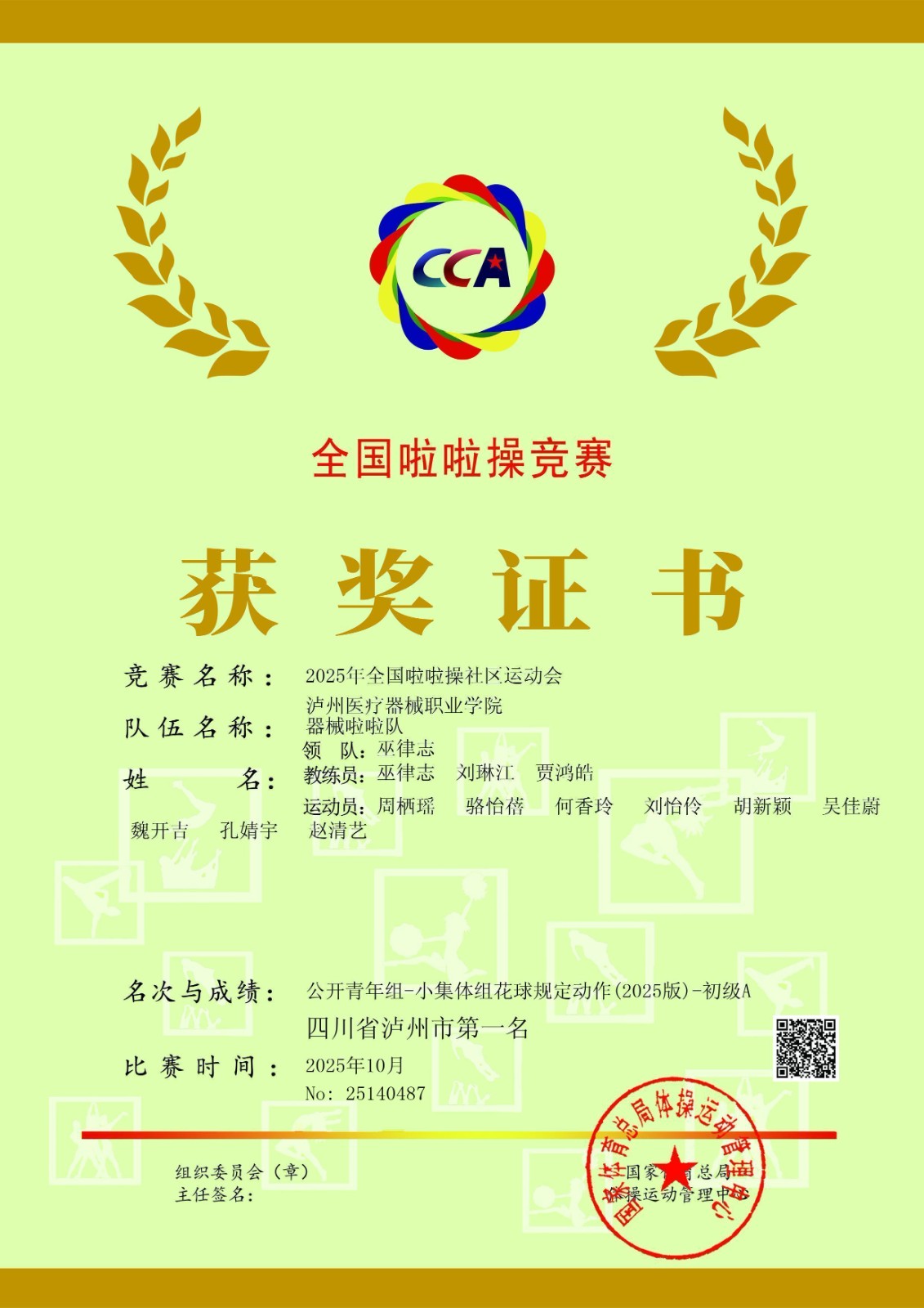 全國決賽匯聚了全國各地眾多隊伍,不僅有實力突出的高職院校,更有眾多本科院校的精英團隊,競技水平達到頂尖水準。備賽期間,巫律志、劉琳江、賈鴻皓教練共同制定針對性訓(xùn)練計劃,帶領(lǐng)隊員歷經(jīng)數(shù)月艱苦集訓(xùn),打磨動作細節(jié)、強化團隊配合。比賽中,隊員們頂住巨大競爭壓力,以默契的協(xié)作和昂揚的狀態(tài)完成表演,最終兩個項目均榮獲全國賽優(yōu)勝獎。